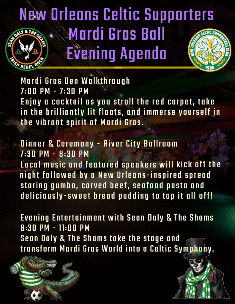 The penultimate event – the Mardi Gras Ball at Mardi Gras World, featuring the music of Sean Daly & The Shams. See below for the evening’s agenda.